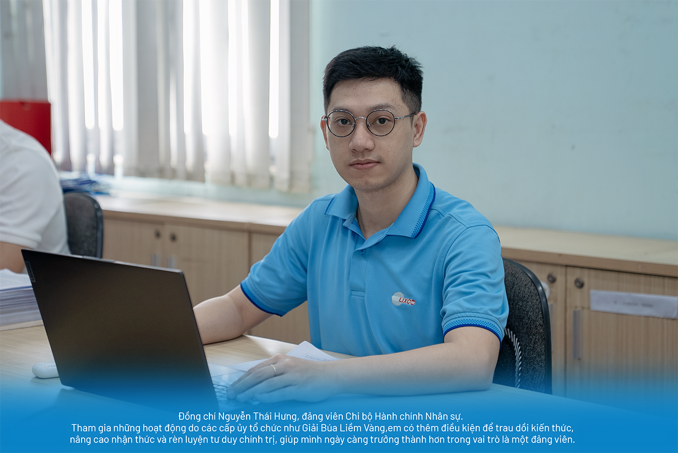 Nguyễn Thái Hưng, là một đảng viên trẻ ưu tú đang sinh hoạt tại Chi bộ Hành chính Nhân sự mà chúng tôi muốn kể tiếp. Từ một thanh niên ban đầu còn suy nghĩ mơ hồ “Đảng không dành cho những đối tượng như tôi” nay đã trưởng thành hơn rất nhiều trong nhận thức và hành động. Từ một nhân viên kế toán xuất sắc, Thái Hưng mạnh dạn chuyển sang công việc liên quan đến phát triển tổ chức tại phòng Hành chính Nhân sự, đồng thời hoàn thành chương trình Trung cấp Lý luận chính trị loại giỏi để trau dồi thêm năng lực, rèn luyện bản thân và nâng cao bản lĩnh chính trị.