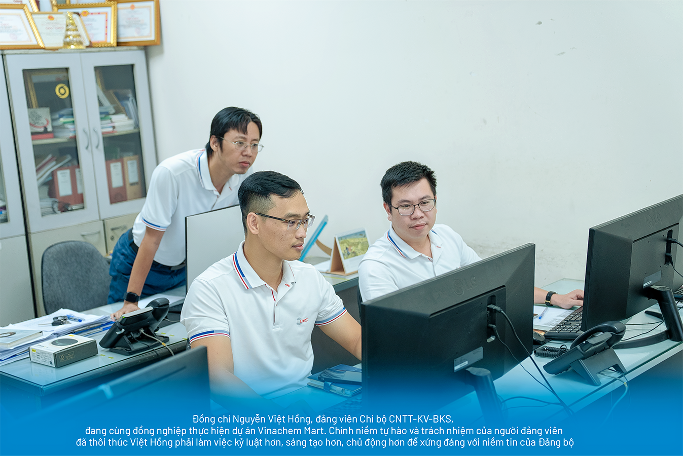 Cũng như Thái Hưng, đảng viên trẻ Nguyễn Việt Hồng, đang công tác tại phòng Công nghệ thông tin, nhận thức được trách nhiệm của bản thân gắn với tinh thần “chuyên” được hun đúc từ lý tưởng Đảng, đồng chí đã quyết tâm nỗ lực, dốc sức và trí tuệ, không ngừng phấn đấu trong công việc. Với việc nhận định rõ mục tiêu phấn đấu đã giúp Việt Hồng đạt được những thành tích ấn tượng, như danh hiệu Nhân viên đột phá, sáng tạo năm 2024. Đồng chí trở thành một trong các thành viên trụ cột trong đội ngũ kỹ sư lập trình và vận hành các dự án lớn về số hóa trong công tác quản trị của Công ty, như các phân hệ “quản lý chất lượng”, “quản lý sản xuất”, “quản lý tiêu chuẩn kỹ thuật”, “quản lý dữ liệu trung tâm và nhân sự”, “kết nối hệ thống robot xếp pallet với hệ thống giao nhận”… trên phần mềm ERP, đặc biệt là dự án kết hợp với Tập đoàn Hóa chất Việt Nam tạo ra sàn thương mại điện tử “Vinachem Mart”.