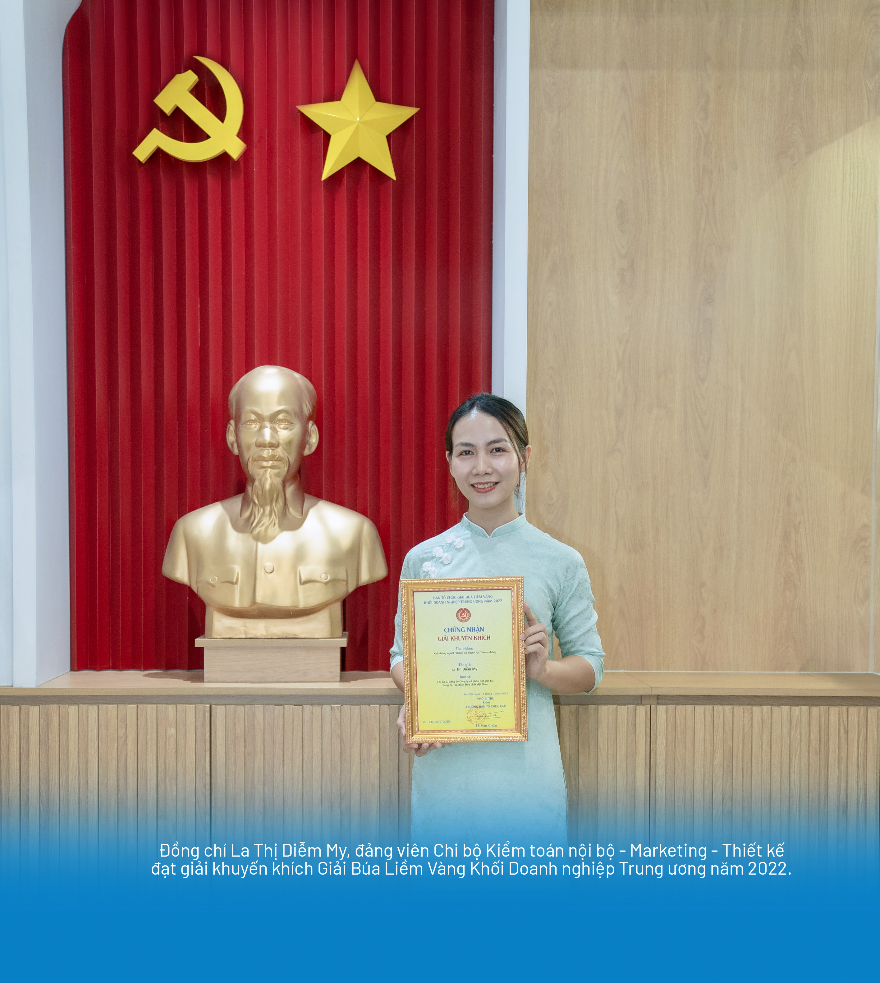 La Thị Diễm My, một đảng viên trẻ tiêu biểu của Chi bộ Kiểm toán nội bộ – Marketing - Thiết kế, cũng là đảng viên trẻ nổi bật của Đảng bộ Công ty. Diễm My được đứng vào hàng ngũ Đảng khi vừa tròn 18 tuổi, một độ tuổi đầy hoài bão và khát vọng.