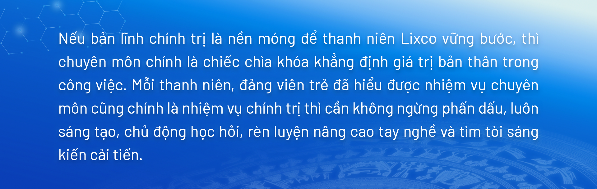 Nếu bản lĩnh chính trị là nền móng để thanh niên Lixco vững bước, thì chuyên môn chính là chiếc chìa khóa khẳng định giá trị bản thân trong công việc. Mỗi thanh niên, đảng viên trẻ đã hiểu được nhiệm vụ chuyên môn cũng chính là nhiệm vụ chính trị thì cần không ngừng phấn đấu, luôn sáng tạo, chủ động học hỏi, rèn luyện nâng cao tay nghề và tìm tòi sáng kiến cải tiến. Bởi chỉ khi năng lực chuyên môn vững vàng mới giúp thanh niên trở thành lực lượng nòng cốt, mới góp phần quan trọng trong sự phát triển của Công ty.