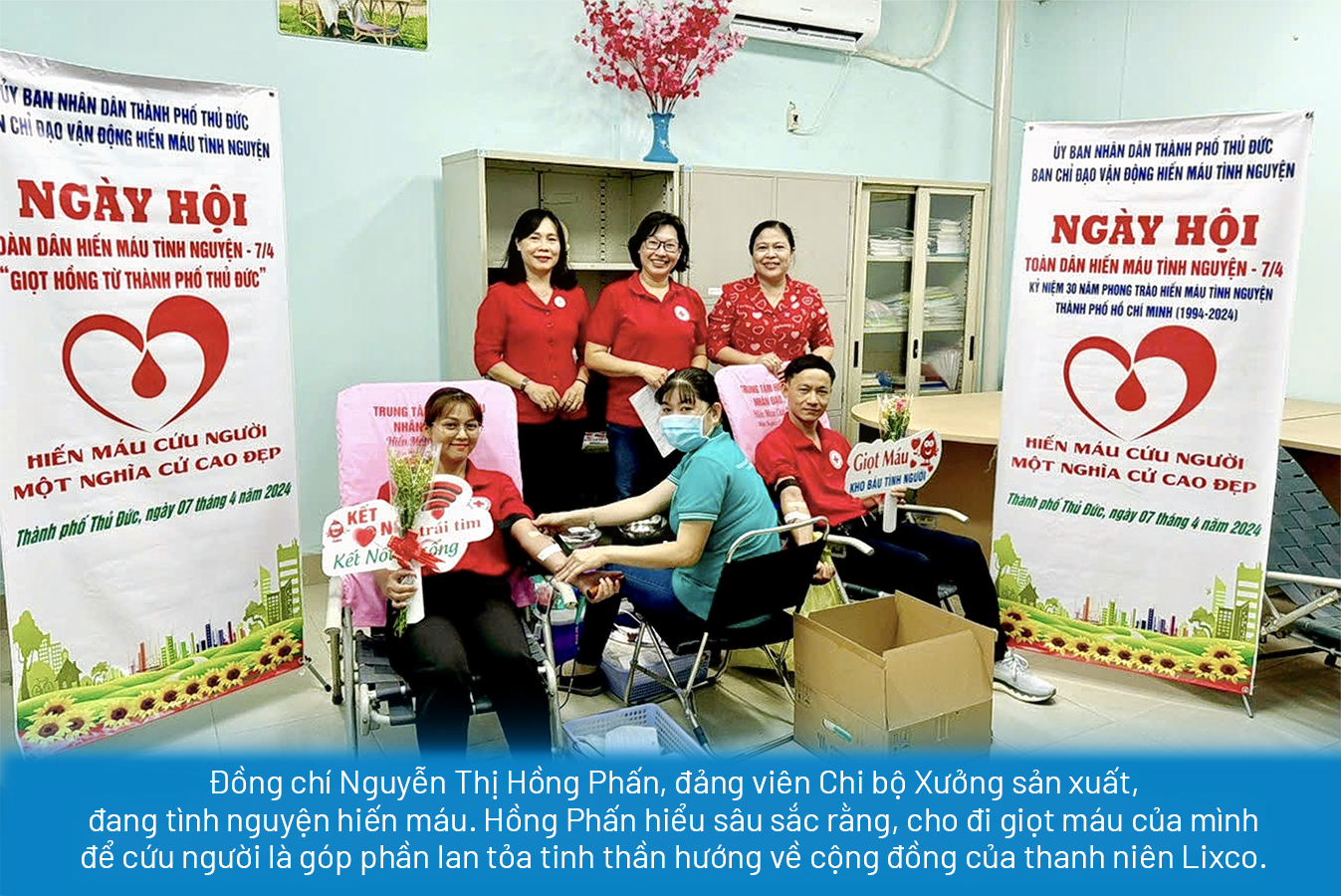 Còn Nguyễn Thị Hồng Phấn, đảng viên Chi bộ Xưởng sản xuất, một nhân tố tiêu biểu của khối lao động sản xuất trực tiếp, không chỉ là gương mặt tích cực trong phong trào nội bộ, mà còn là biểu tượng sống động cho sứ mệnh lan tỏa giá trị của thanh niên Lixco. Hết mình hỗ trợ cộng đồng, góp sức trong các chương trình xã hội của Đoàn Thanh niên. Đáng chú ý nhất là “gia tài” đặc biệt của Hồng Phấn – 8 cuốn sổ đỏ hiến máu với 2. 700 ml đã cho đi. Từng con dấu, từng mốc thời gian ghi nhận những lần tình nguyện cho đi giọt máu của mình để cứu người là thêm bấy nhiêu chiều dày đạo đức cách mạng của đồng chí được bồi đắp thêm.